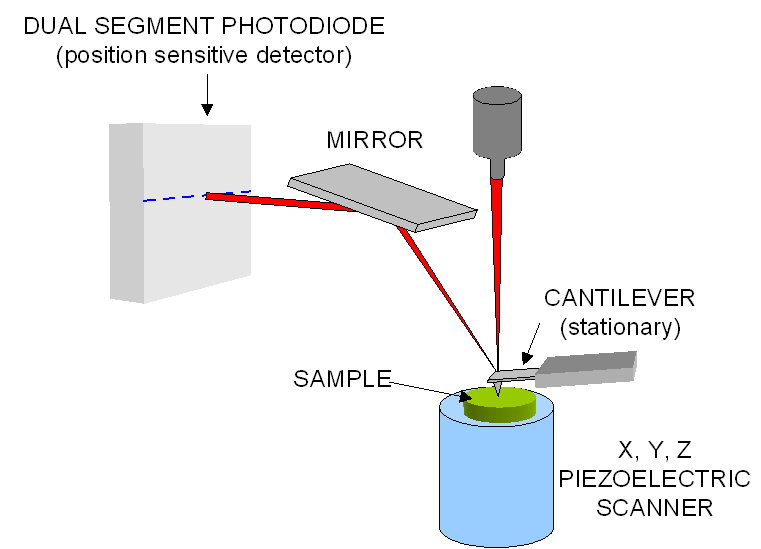 Atomic force microscopy measures the interaction between a tip affixed on a cantilever and a sample’s surface. The cantilever acts as a spring with a known force constant, and a laser reflected off of the cantilever onto a detector is used to measure the cantilever deflection. As the tip is scanned across the sample in a raster pattern, the deflection at each position is saved and compiled into a map. Typically, a mirror is used to lengthen the laser path and allow for a higher sensitivity of deflection detection. Using the force constant and cantilever deflection, the atomic force repulsion between the sample and tip may be calculated with Hooke’s law ($F = -kx$).