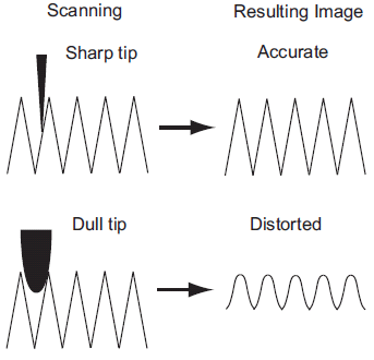 The images produced by AFM are limited by the nature of the tip. If a surface protrusion is narrower than the tip, the image displayed will simply be an image of the tip. Moreover, if a surface cavity is more narrow than the tip, the tip will not be able to enter and thus will not display the cavity. An ideal AFM tip would be narrower than any asperity on the surface, giving a near-true image of the material topography. Tips may be characterized by scanning over a reference sample that has many small, sharp protrusions. The repeated image displayed at each asperity represents the shape of the tip. If a probe has more than one tip, this is apparent in the image.