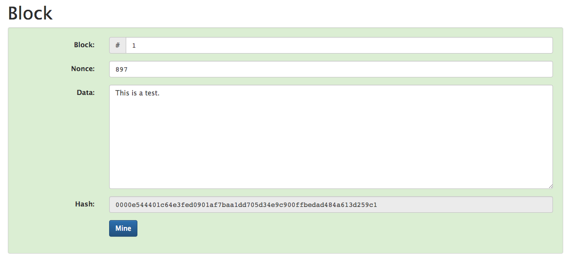 When you click the "Mine" button the computer will start with an initial nonce value of 1, and increment the nonce until the resulting hash meets the specified criteria. In this demo, we're looking for a nonce value that results in a hash beginning with four zeros.