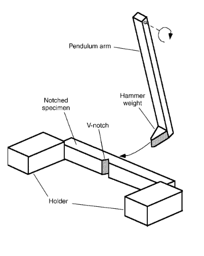 The Charpy impact test, depicted below, measures the amount of energy absorbed upon impact. A weighted pendulum, which is held at some height $h$ from the sample, swings and impacts the sample at a very high strain rate. The pendulum then continues to swing until reaching a final height of $h'$. The difference between the potential energies at height $h$ and $h'$ is considering to be the energy that the sample absorbed upon impact.