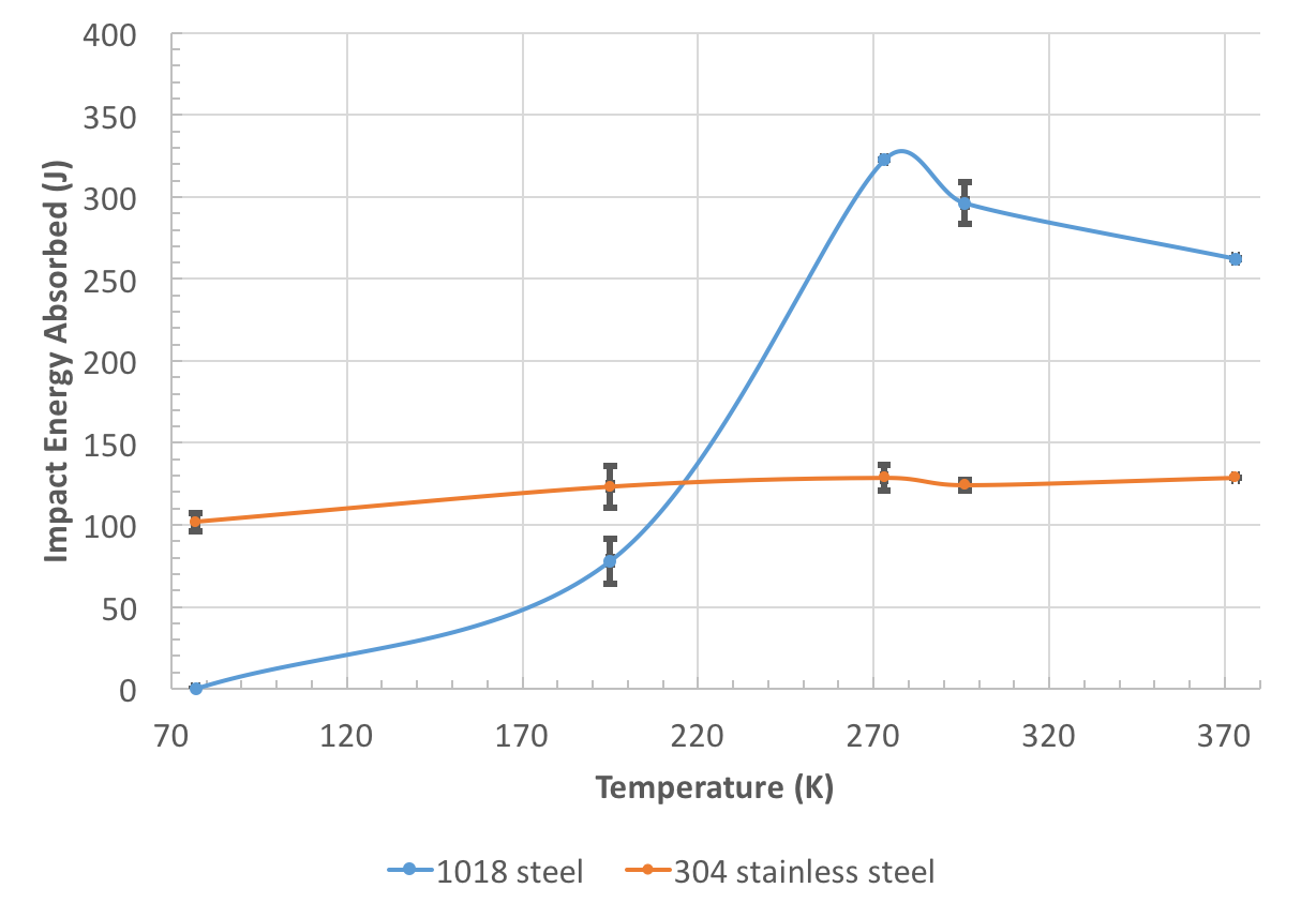 I'll provide some data from an undergrad lab experiment which examines the impact behavior for annealed 1018 steel and 304 stainless steel. Annealed 1018 steel is a low-strength BCC steel, which exhibits a ductile-brittle transition as shown above in the general behavior schematic. 304 stainless steel is a low-strength FCC metal, which has close-packed planes that allow for dislocation movement at all temperatures. Thus, this metal does not exhibit a ductile-brittle transition. The ductile-brittle transition temperature, $DBTT$, may be approximated as the temperature that corresponds with the energy calculated from