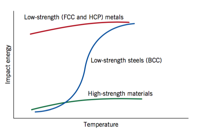 The figure below displays the general behaviors for various materials including FCC metals, BCC metals, and high-strength materials with regard to the Charpy impact test. A ductile-brittle transition temperature is observed for metals with a body-centered cubic structure as a result of the dependence on temperature for dislocation motion.