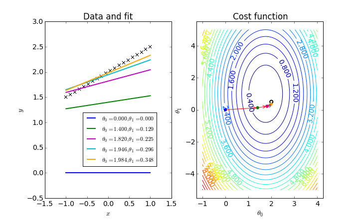 The following figure displays a gradient descent optimization of a linear regression model, where two parameters are optimized by finding the minimum value on the 3D cost function (represented by a contour plot).