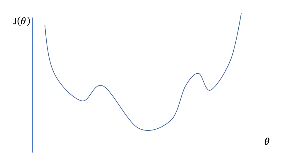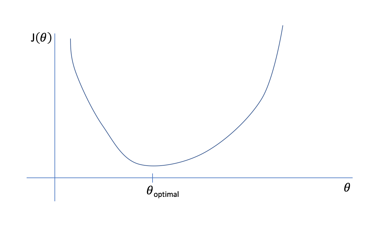 Let's start off with an extremely simple example of a model with only one parameter. We can plot an arbitrary cost function, $J\left( \theta \right)$, as a function of $\theta$. Viewing this plot, it is easy to see what the best parameter for the model is (labeled as $\theta _{optimal}$) as it leads to the least amount of error possible in the model.