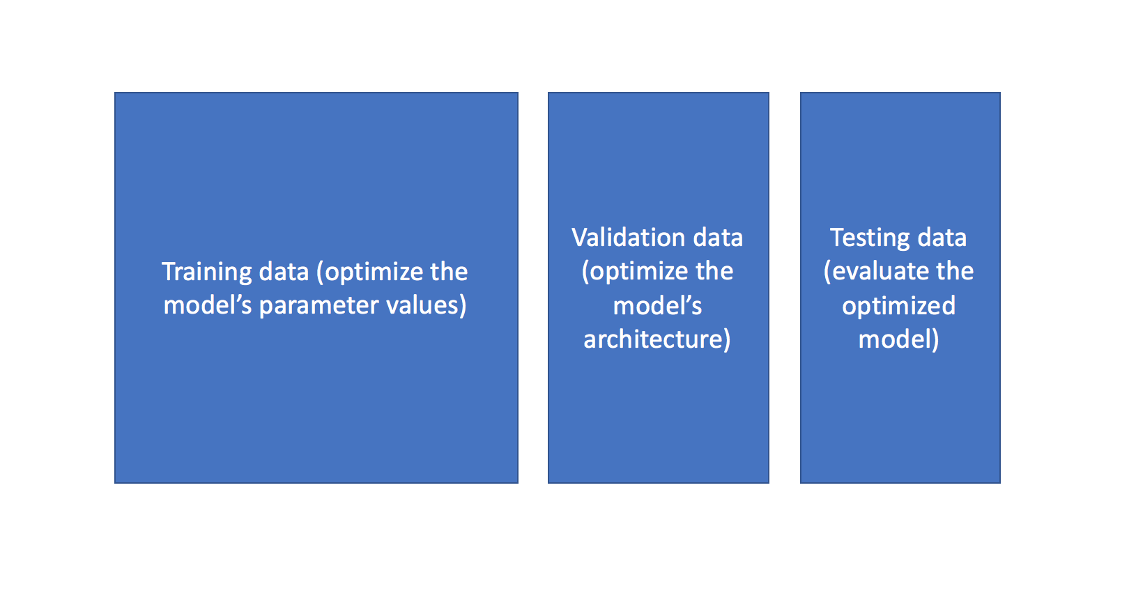 To mitigate this, we'll end up splitting the total dataset into three subsets: training data, validation data, and testing data. The introduction of a validation dataset allows us to evaluate the model on different data than it was trained on and select the best model architecture, while still holding out a subset of the data for the final evaluation at the end of our model development.