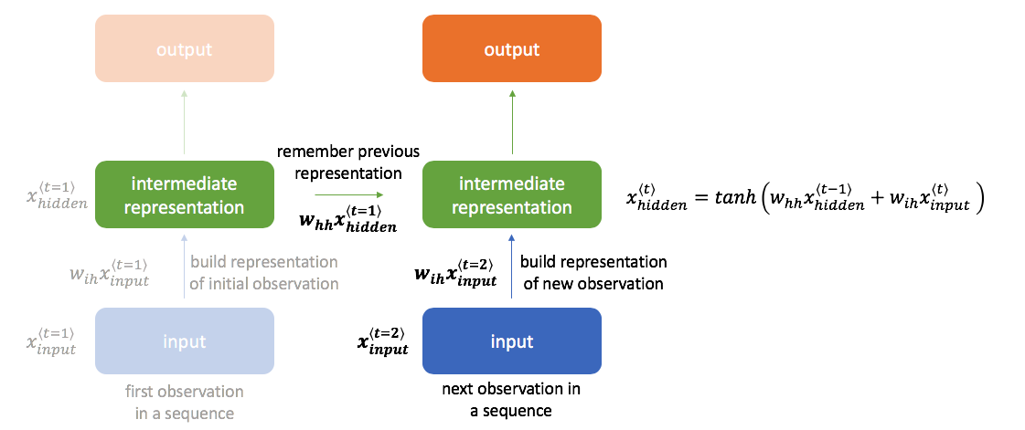 The basic method for combining these two pieces of information is shown below; however, there exist other more advanced methods that we'll discuss later (gated recurrent units, long short-term memory units). Here, we have one set of weights $w_{ih}$ to transform the input to a hidden layer representation and a second set of weights $w_{hh}$ to bring along information from the previous hidden state into the next time-step.