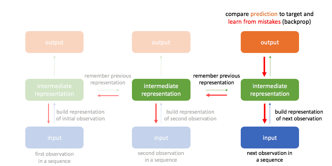 By always remembering the previous hidden state, we're able to chain a sequence of events together. This also allows us to backpropagate errors to earlier timesteps during training, often referred to as "backpropagation through time".