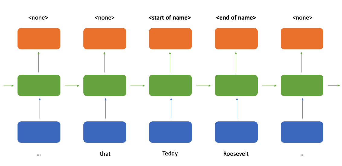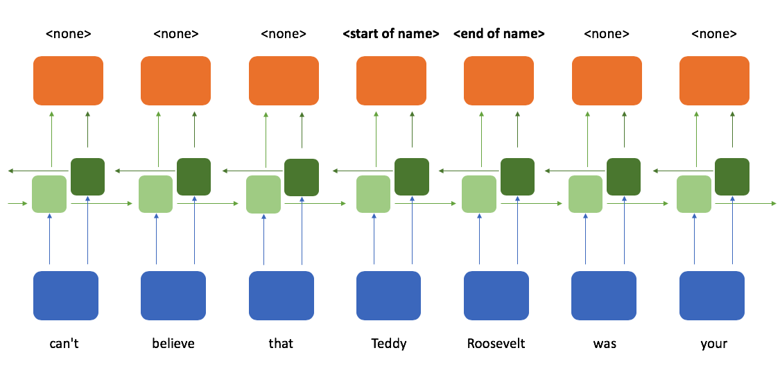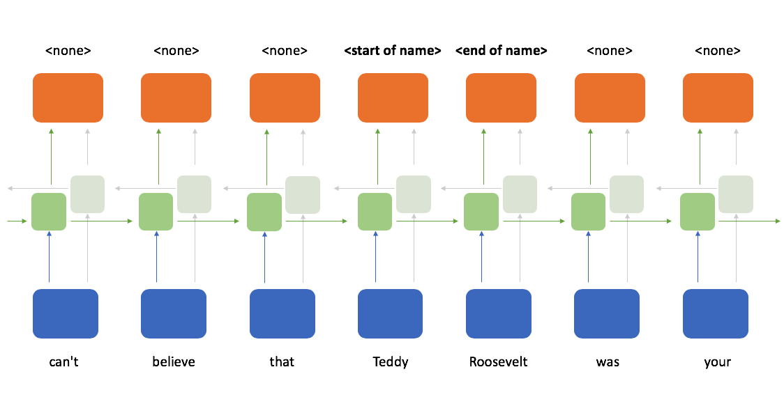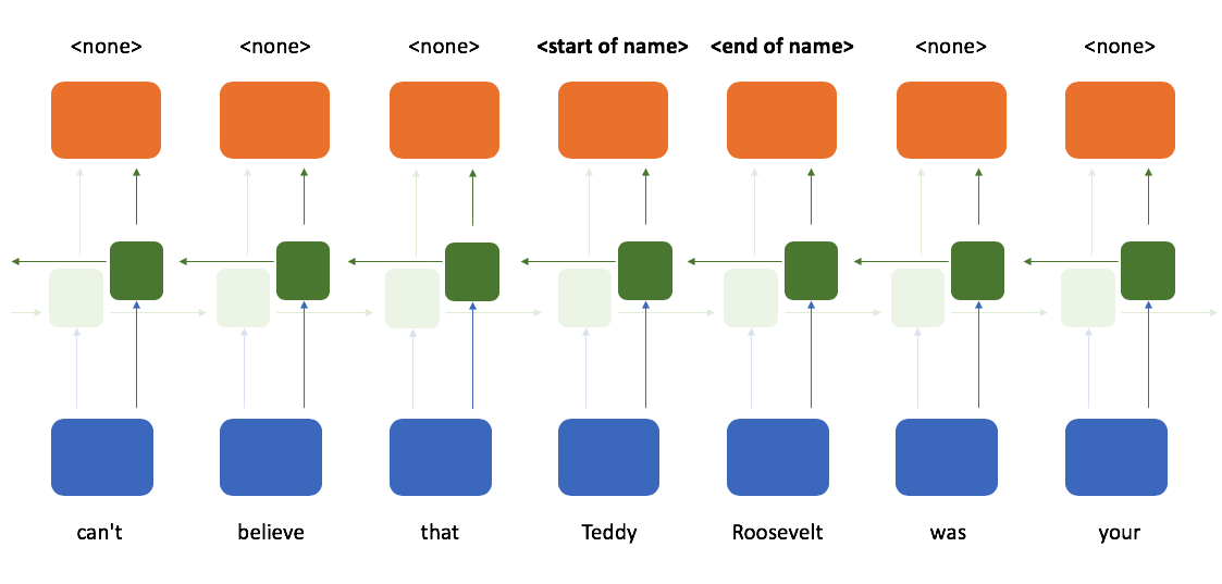 When determining whether or not a token is the start of a name, it would sure be helpful to see which tokens follow after it; a bidirectional recurrent neural network provides exactly that. Here, we process the sequence reading from left-to-right and right-to-left in parallel and then combine these two representations such that at any point in a sequence you have knowledge of the tokens which came before and after it.