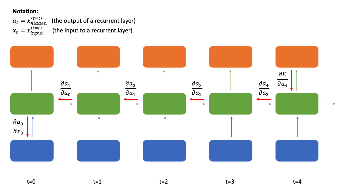 Let's suppose one of the weights in our matrix is 0.5 and we're attempting to send a signal back 10 time-steps. By the time we've backpropagated to $t-10$, we've multiplied the overall gradient expression by $0.5 \cdot 0.5 \cdot 0.5 \cdot 0.5 \cdot 0.5 \cdot 0.5 \cdot 0.5 \cdot 0.5 \cdot 0.5 \cdot 0.5 = 0.00098$. This has the effect of drastically reducing the magnitude of our error signal! This phenomenon is known as the "vanishing gradient" problem which makes it very hard to learn using a vanilla recurrent neural network. The same problem can occur when the weight is greater than one, introducing an exploding gradient, although this is slightly easier to manage thanks to a technique known as gradient clipping.