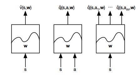 Each of these models are defined by a set of parameters, $\theta$ (also sometimes referred to as weights, $w$). With this value function approximator, we'll input a feature vector that describes a state or state-action pair and output the approximated value. In the following section, I'll discuss how we can train these model parameters to most closely match our best estimate of the value function.