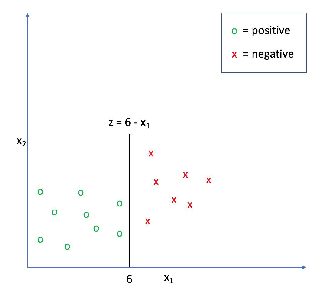 For example, in the following graph, $z = 6 - {x _1}$ represents a decision boundary for which any values of ${x _1} > 6$ will return a negative value for $z$ and any values of ${x _1} < 6$ will return a positive value for $z$. For the case where we have two features, our decision boundary happens to be a line. More generally, we'll refer to this boundary as a hyperplane- a subspace which consists of one less dimension than your feature space. Thus, if we were to draw a decision boundary for a dataset with three features, our boundary would be a plane.