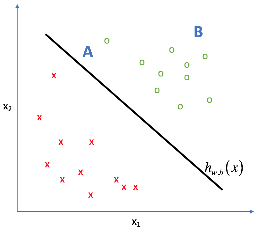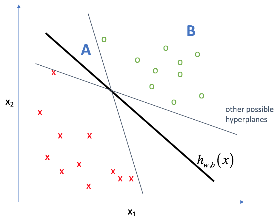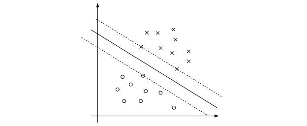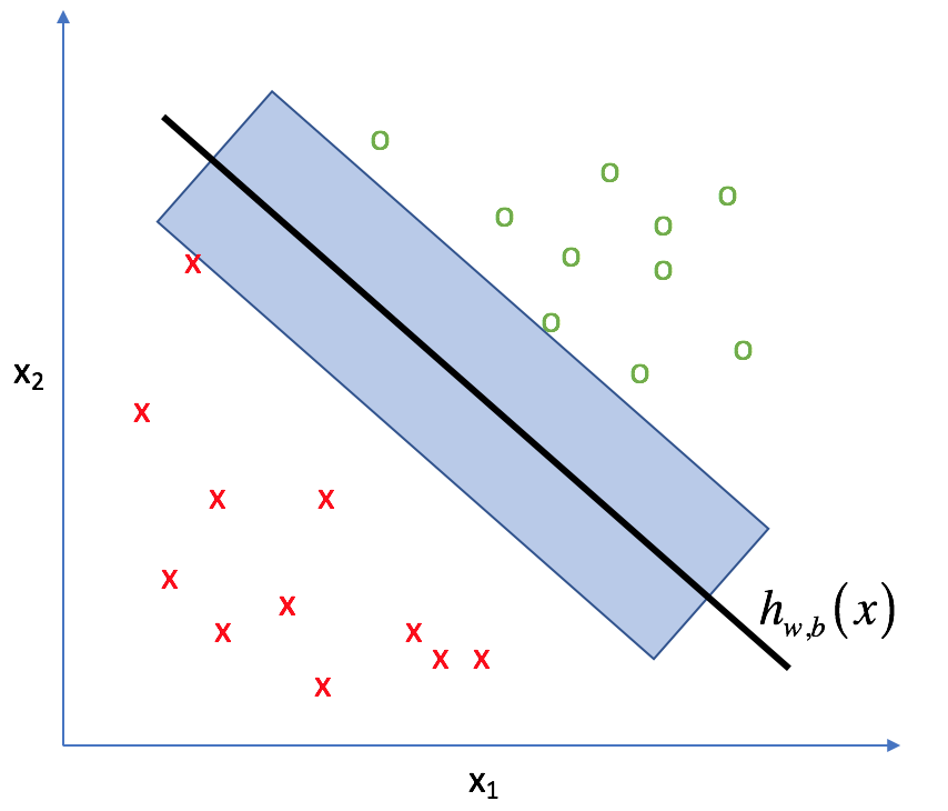 In other words, we'd like to construct a hyperplane that is consistent with the data while committing the least amount to the specific training dataset - models that depend too much on the training data are prone to overfitting. We want to have the most space possible between the decision boundary and the data points on each side of the line in order to increase the total confidence in our predictions.