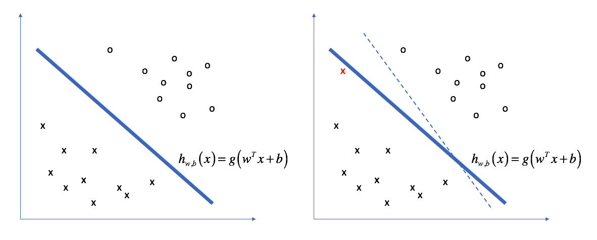 Essentially, we are now allowing the decision boundary to do a worse job classifying a few points in favor of doing a better job on the majority. Focusing on the majority allows for us to build a model which is more likely to generalize well and prevents our decision boundary from fluctuating wildly if we start to introduce outliers when training.