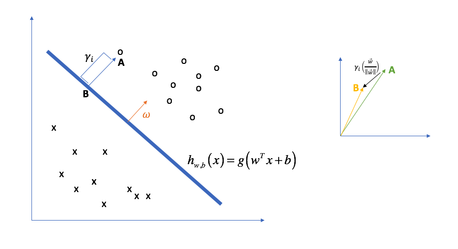 Note: If ${\left| w \right|}=1$, then the functional margin, ${\hat \gamma }$, and the geometric margin, $\gamma$, are equivalent expressions.
