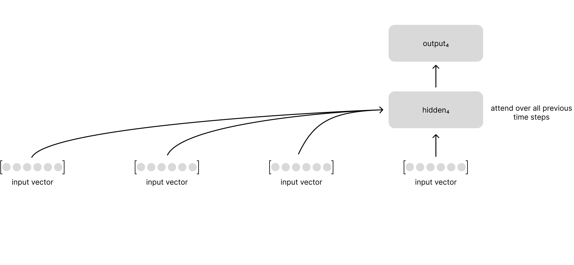 Notice how there is no longer information flowing through the hidden state representation like we had in the unrolled recurrent neural network; in this new architecture, each time-step instead looks back across the entire input sequence.
