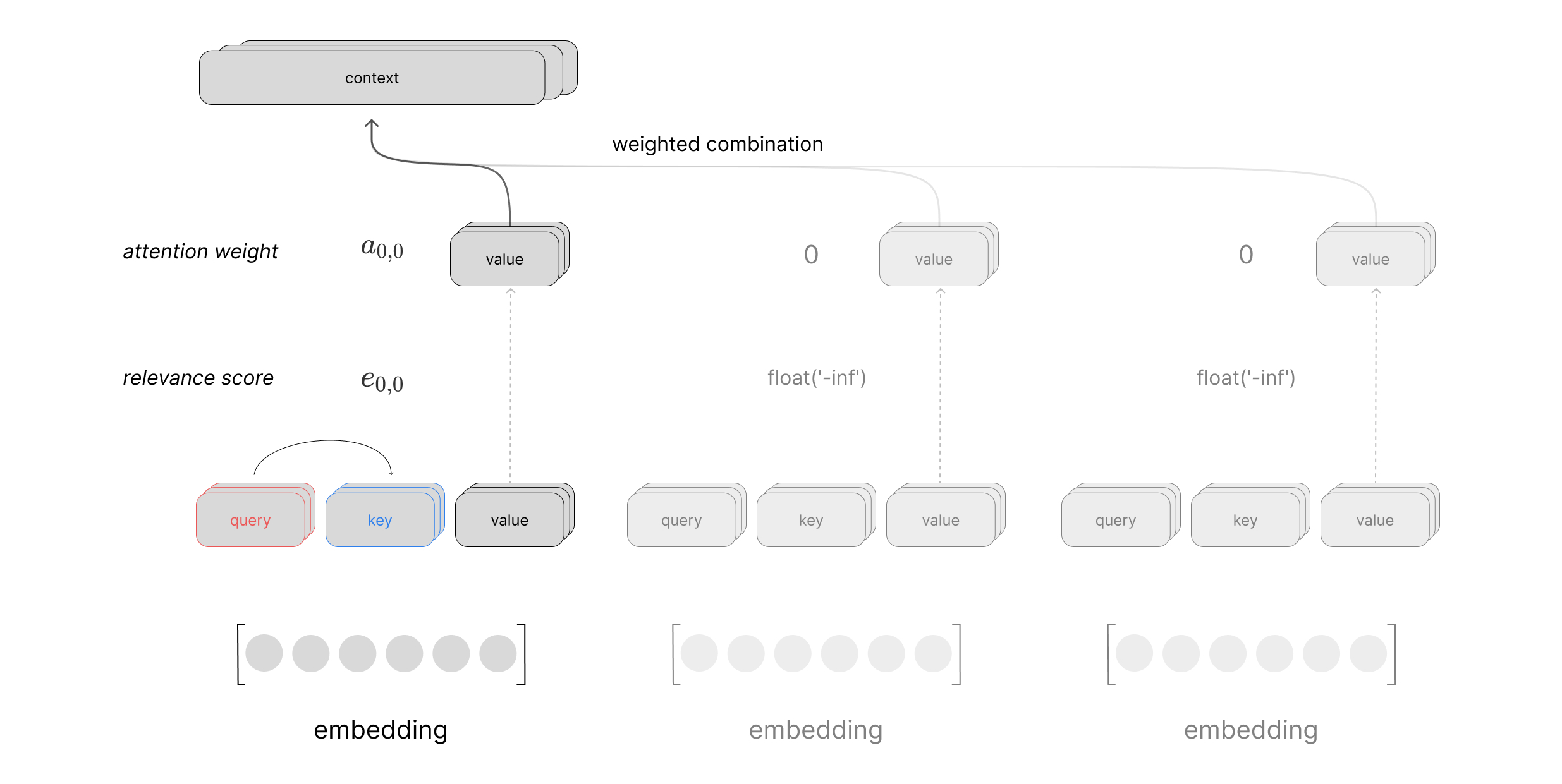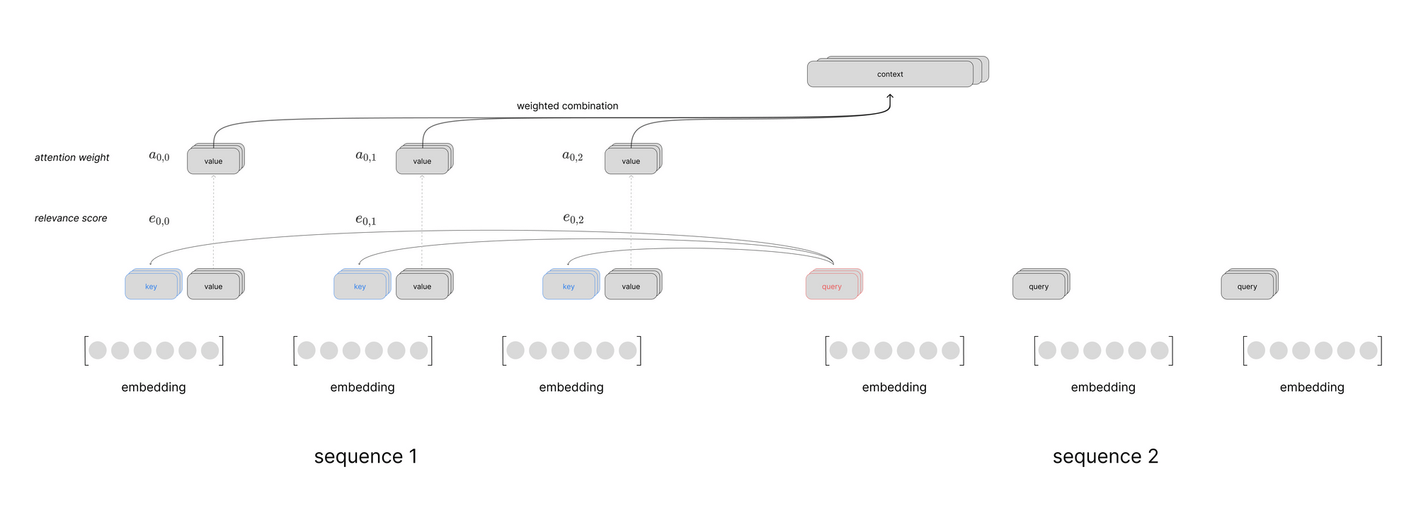 where our weights matrices $W$ are used to project the input into our query, key, and value vectors and the corresponding relevance scores are denoted as $e_{i,j}$. Here, $i$ denotes our index into a matrix of reference vectors $X^{\text{ref}}$ and $j$ represents the index into the matrix of candidate vectors $X^{\text{cand} }$. For simplicity, we focus the attention calculation on a single reference vector but in practice this can be done in parallel as a single matrix operation treating every vector in our sequence as a reference vector.