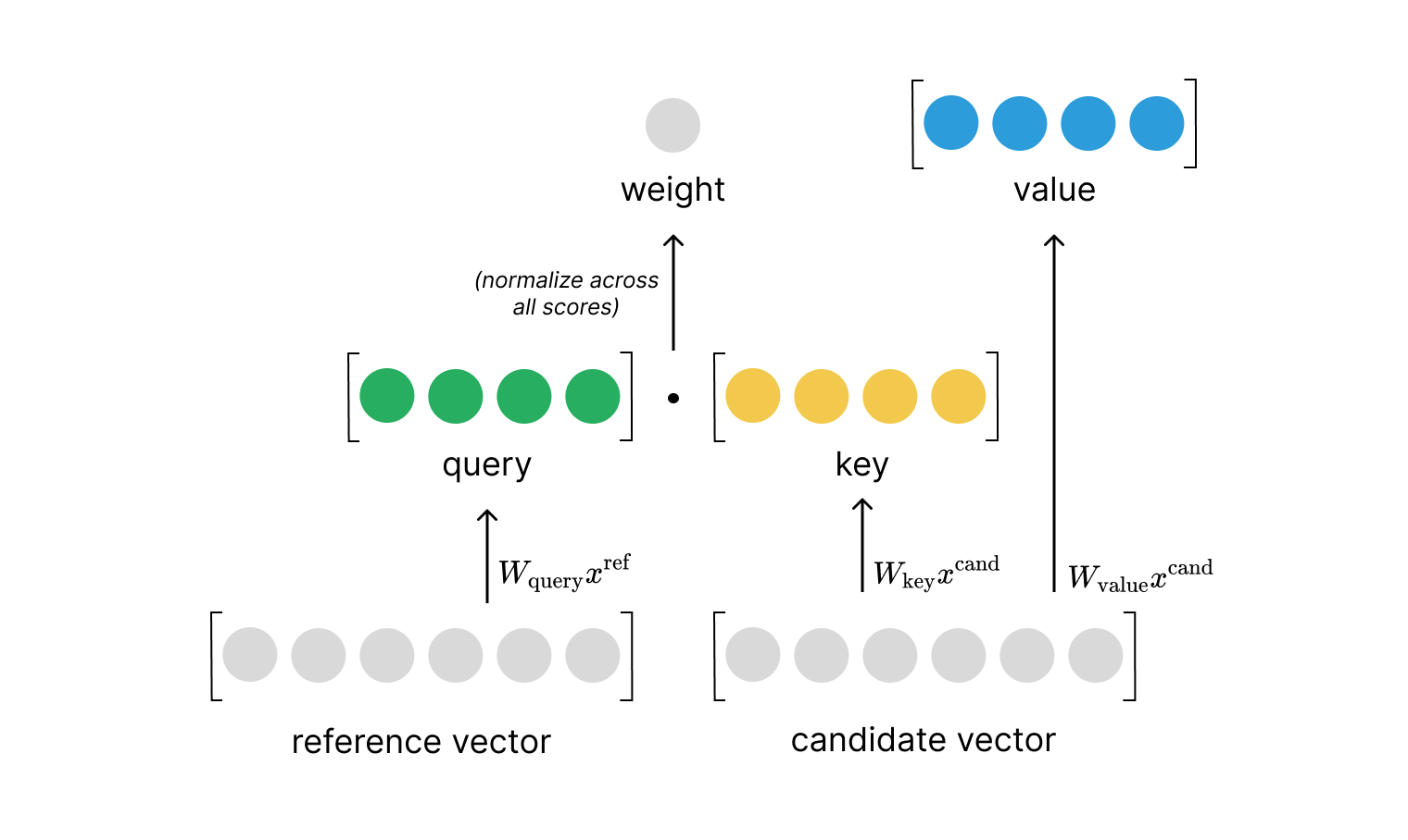 $$\text{relevance} \left( x^{\text{ref} },\ x^{\text{cand} }\right) =\frac{1}{\sqrt{d_{k}} } \left( W_{\text{query} }x^{\text{ref} }\cdot W_{\text{key} }x^{\text{cand} }\right) =\frac{1}{\sqrt{d_{k}} } \left( q\cdot k\right)$$